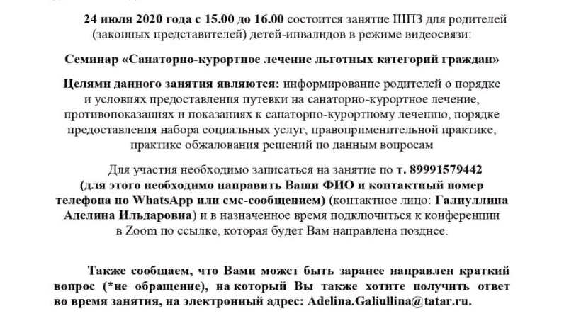 24 июля 2020 года с 15.00 до 16.00 состоится занятие для родителей (законных представителей) детей-инвалидов в режиме видеосвязи: Семинар «Санаторно-курортное лечение льготных категорий граждан».