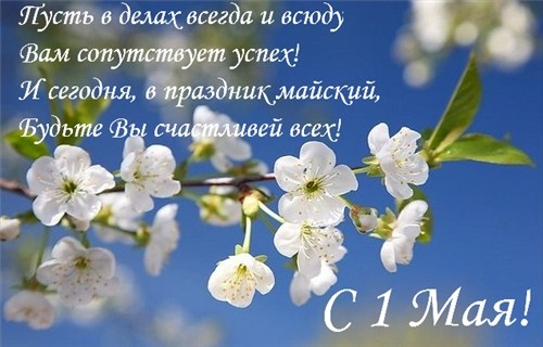 Поздравляем всех с майскими праздниками! Первомай- символ глубокого уважения к человеку труда,воплощение идеи мира , возрождения и созидания. Мир и Труд-залог успешного развития любого общества, достижения всех намеченных планов.Желаем всем спокойствия и достатка в доме, здоровья и удачи родным и близким, успехов во всех добрых делах.