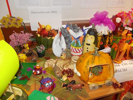 Вчера в РДК прошла выставка поделок «Дары осени» , подготовленная работниками клубов и библиотек сельских поселений. Каких только поделок не привезли со всех уголков района! Сколько всего занимательного и интересного было представлено : и кареты из тыквы, корзины с овощами и фруктами, яйца украшенные бисером и многое другое.